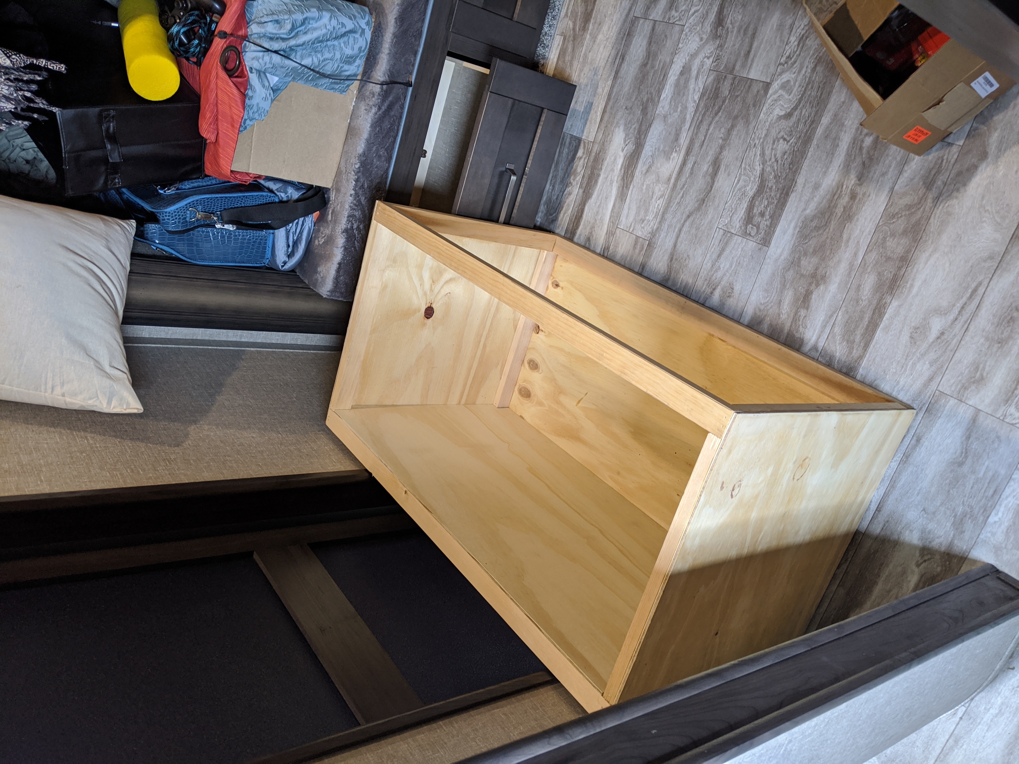 While my dad and I worked on the litter box together, Ryan spent a couple of weeks building a desk for himself. In our RV, we had the extra room with the bunkbeds. There was also a dresser in that room. Ryan had planned on using this room as his office so he needed a desk to work on.