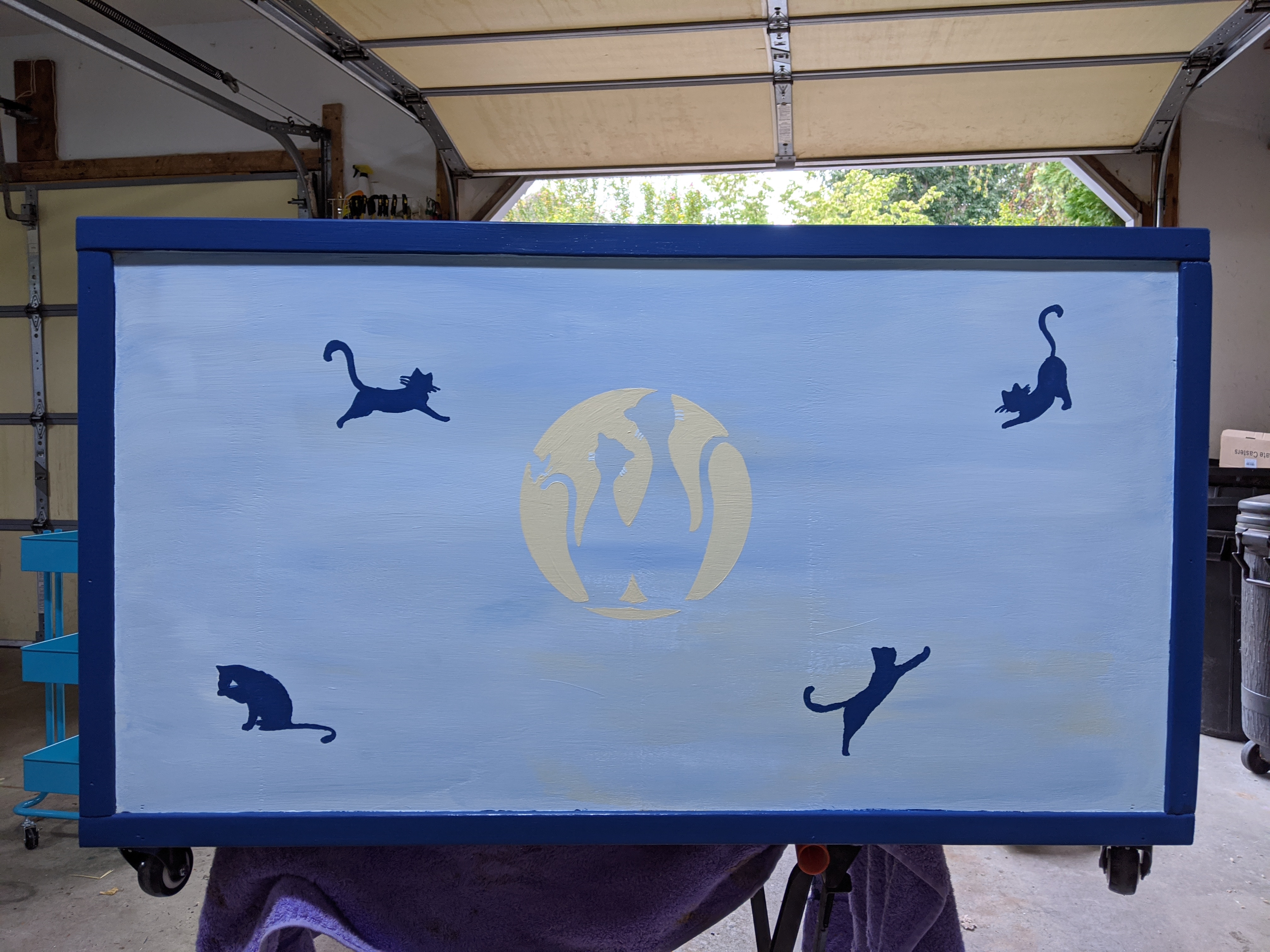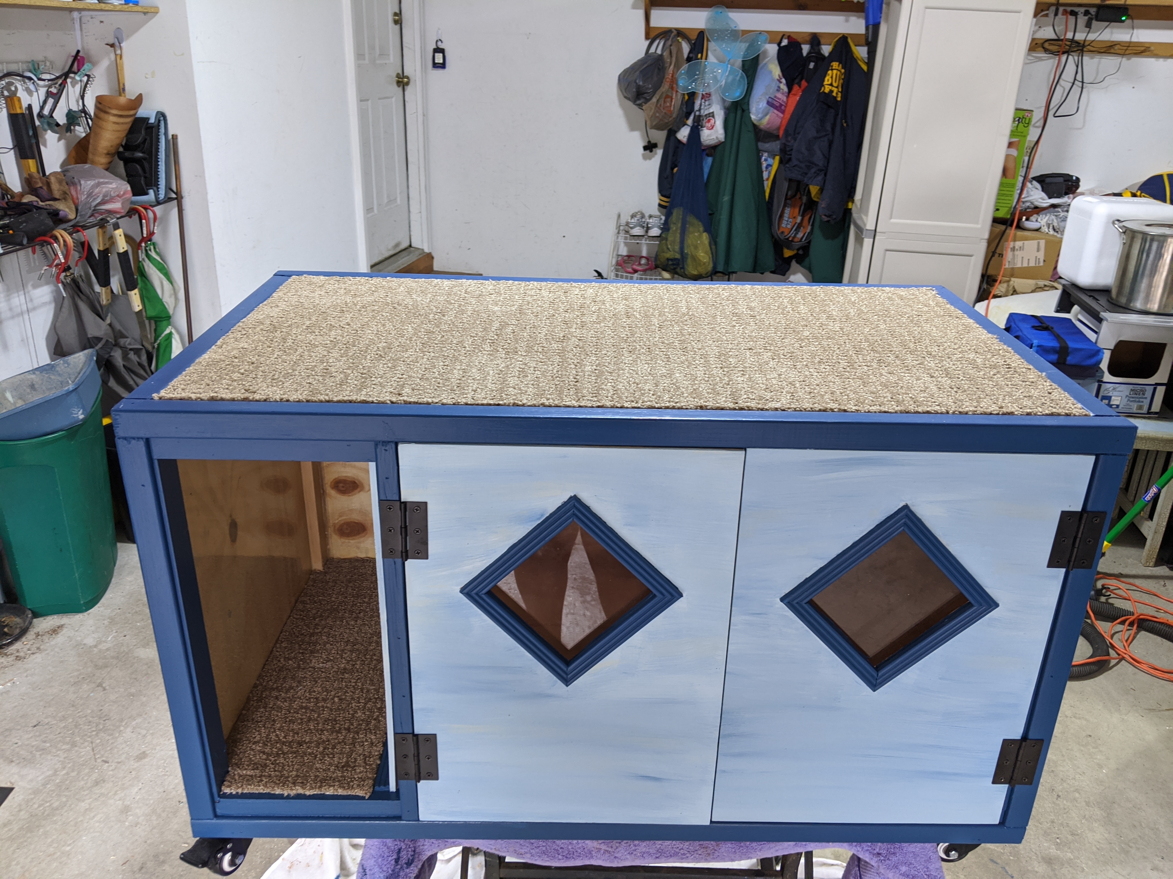 My dad had a lot of great ideas for making the box look nice, as if it is just furniture. He had the ideas to add the trim and the fancy windows. He thought the windows would be good to have because we could at least see in the box enough to see if a cat is in there in case we can’t find one of them. It also gives them a little light when they’re inside. He likes to joke around saying I need to put curtains on the inside so if they want privacy, they can close the curtains.