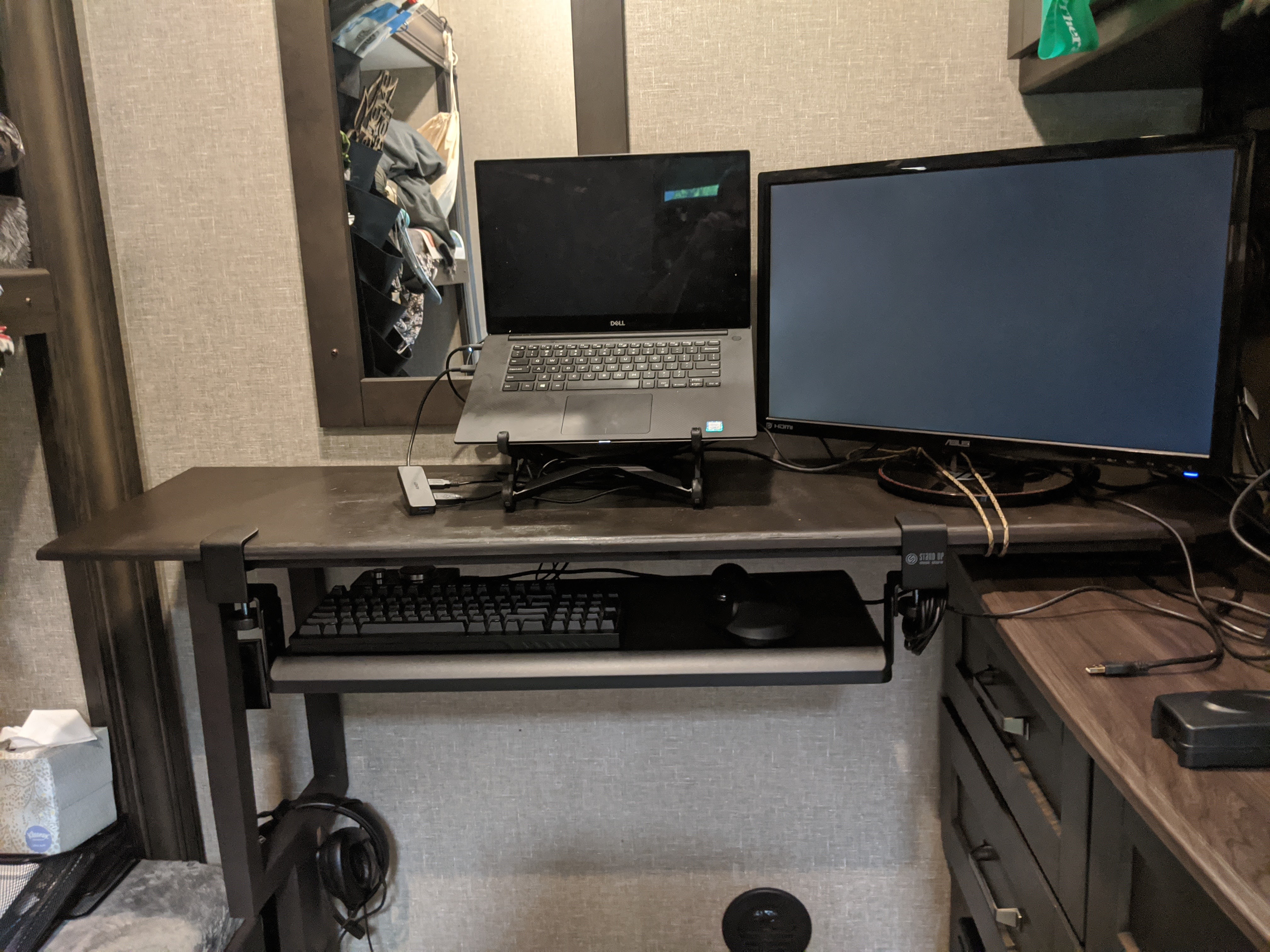 He decided to build one, but he had to be creative on how to go about it. The office has a slide out so during travel we have to put the slide in, which makes the room much smaller. That means a desk cannot just sit in the middle of the room. Ryan decided to build a desk on top of the dresser so when the slide is out, he can swivel the desk into place for him to use, but during travel he can swivel it back over the dresser so it does not take up any extra space in the room. It was a very creative idea that he came up with and the outcome was great.
